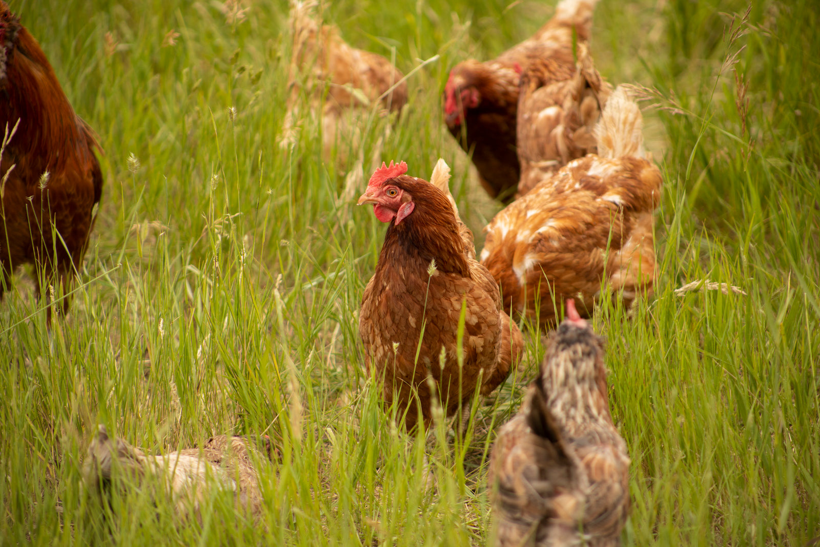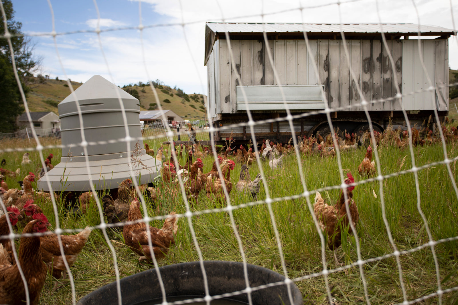 We raise a diverse mix of laying breeds on our pastures, though in recent years we have begun to raise more standard brown egg laying hens as they are more productive and easier to raise. Our hens are given unlimited access to our land during the day and retreat safely to their coops at night. They are protected from predators by our working livestock guardian dogs and electric net fencing, which is moved weekly during the grazing season. In addition to the bugs and plants they forage, we supplement our hens with a feed of barley, peas, wheat, sunflower, organic poultry mineral, amino acids and enzymes. As with all of our feed, our grains are 100% Montana grown and then custom ground and mixed by us on our farm. The result is happy hens and nutritious eggs with tall, dark yellow to orange yolks and firm whites. Our eggs are much fresher than any you can find in the store and you will be able to notice the difference when you crack one open!