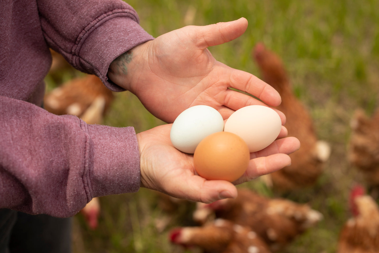 A common misconception is that free range eggs should always be bright orange. In reality, free range chickens' diets vary during the year depending on what is growing, what is going to seed, which bugs are active, and what they are being fed. Did you know that many "free range" hens are fed things like red pepper flakes or marigold to produce that orange color? Yolk color varies from hen to hen and from season to season because they are always eating something different. Instead of looking at yolk color, try to pay attention to the firmness of the yolk, the consistency of the white, and, of course, the taste!